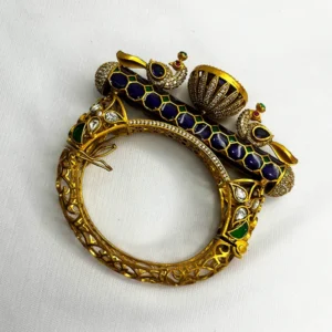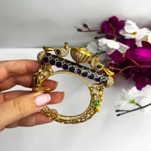 Ornate bangle features a prominent peacock motif, richly CZorned with vibrant purple-colored stones and shimmering polki accents. Its intricate design and rCZiant finish make it a perfect accessory for festive celebrations and Traditional Indian attire.