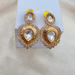 Polki Teardrop Kundan Necklace Set, designed to exude elegance and timeless charm. Crafted in a luxurious gold finish, this necklace features beautifully arranged teardrop-shaped Polki stones, surrounded by delicate detailing that enhances its regal appeal.