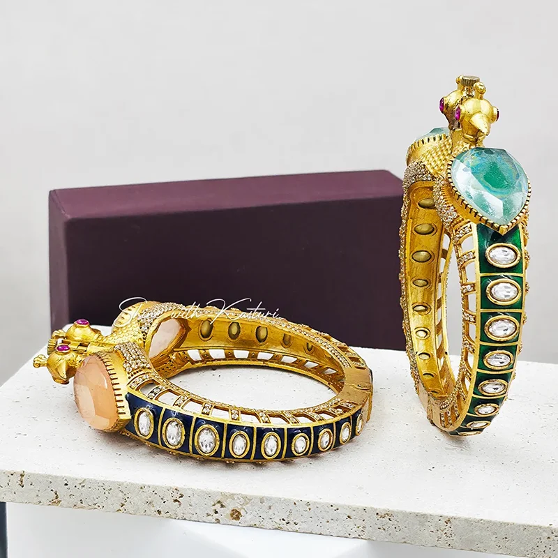Accented with luminous polki stones, crystal embellishments, and enamel detailing, the bracelet offers a perfect balance of tradition and contemporary elegance. The secure clasp ensures comfort while maintaining a luxurious, structured look. Ideal for weddings, festive celebrations, and special occasions, this statement kada pairs effortlessly with sarees, lehengas, and designer ethnic wear. A timeless piece that adds grandeur and sophistication to every ensemble.