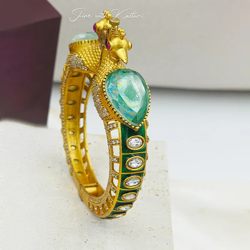 Make a bold royal statement with this Regal Peacock Motif Polki Stone Kada Bangles, inspired by heritage Indian artistry. Crafted in a rich gold finish, this stunning kada features beautifully sculpted peacock heads symbolising grace and royalty.