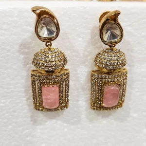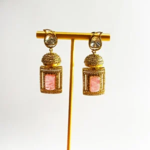 Necklace set features a prominent rose quartz centerpiece with intricate Mughal-inspired detailing. Adorned with polki diamonds, the matching drop earrings complete this unique and ornate design. Perfect for special occasions, reflecting Indian heritage.