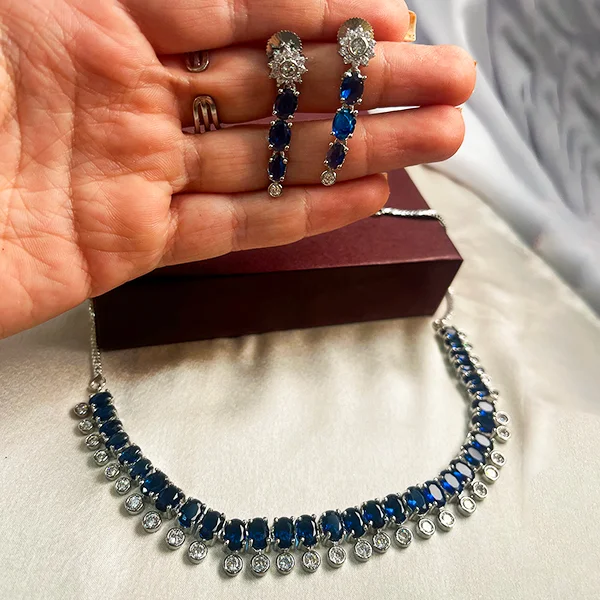 The Orion Necklace Set is bold and captivating, designed to make a statement. The necklace features large crosslink chains, each beautifully accentuated with sparkling AD stones and a circular detail. A striking teardrop pendant adds a pop of color, exuding elegance and sophistication. Paired with matching earrings, this set offers a luxurious, modern touch that’s perfect for making any occasion unforgettable. Available in colours purple and blue.
