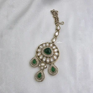 Delicate pearl strings on both sides enhance the grandeur of the piece while ensuring a comfortable fit. The set includes matching statement earrings and a coordinating maang tikka, completing your bridal or festive look effortlessly.