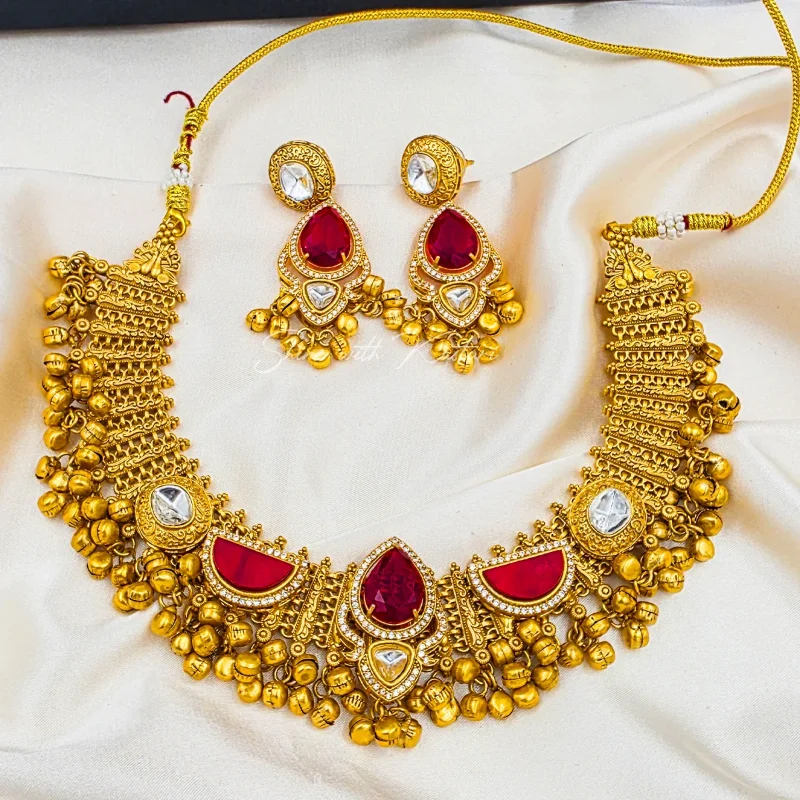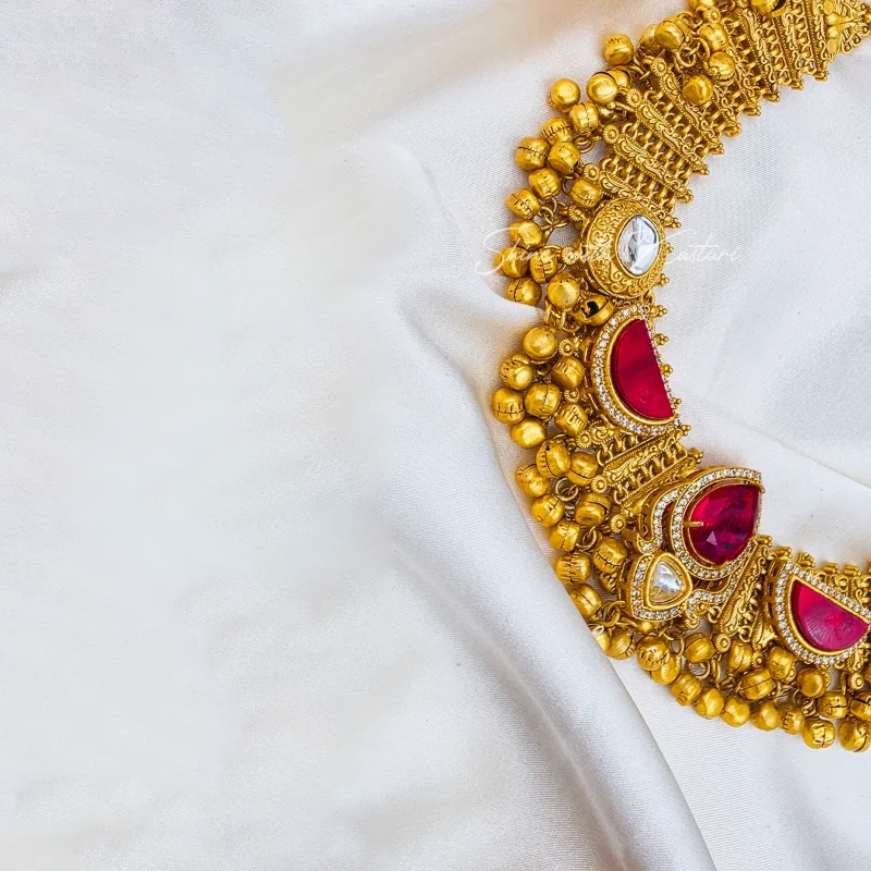 The intricate gold-plated craftsmanship highlights delicate traditional motifs and fine detailing, giving the necklace a rich antique-inspired aesthetic. The bold central ruby stone creates a striking focal point, while the graceful arrangement of polki kundans and mother of pearl stones adds depth and sophistication.Perfect for weddings, bridal ceremonies, festive celebrations, and grand occasions, this heritage choker pairs beautifully with lehengas, sarees, and traditional ensembles.