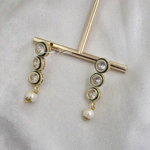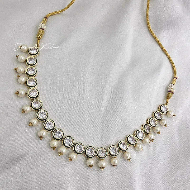 Royal Pearl Drop Kundan Necklace, a perfect blend of tradition and elegance. Crafted with precision, this necklace features a graceful row of shimmering Kundan stones set in a gold-tone finish, radiating timeless charm.