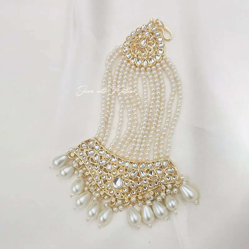 Royal Pearl Kundan Passa Hair Accessory, Designed with intricate gold-tone kundan detailing, this stunning piece features delicate layered pearl strings and graceful pearl drop embellishments that create a rich and regal finish.