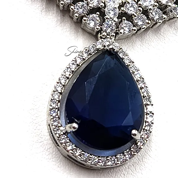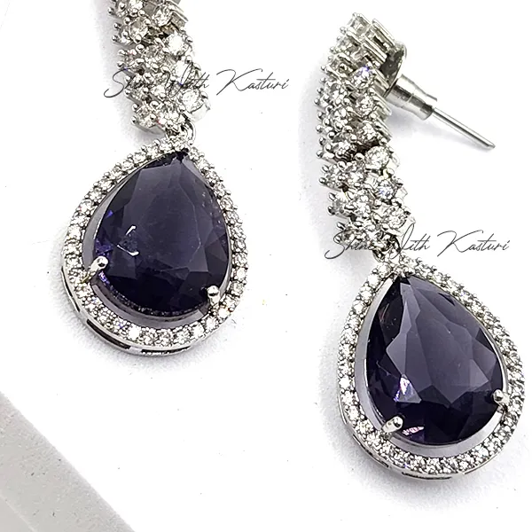 Royal Purple CZ Drop Necklace Set showcases timeless sophistication with its teardrop-shaped purple stones and shimmering cubic zirconia detailing. The necklace and matching earrings create a luxurious, coordinated look perfect for weddings, receptions, or evening events. With its flawless sparkle and modern silver finish, it’s designed to make every outfit shine with elegance.