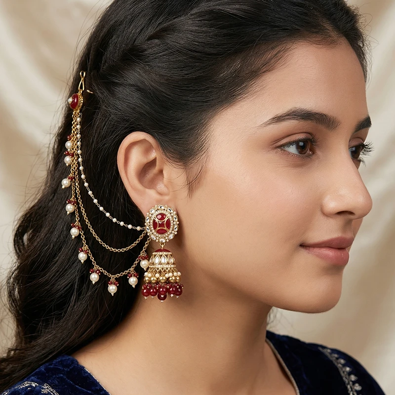 Ruby Kundan Jhumka Pearl Ear Chain, this piece beautifully combines traditional elegance with statement detailing.