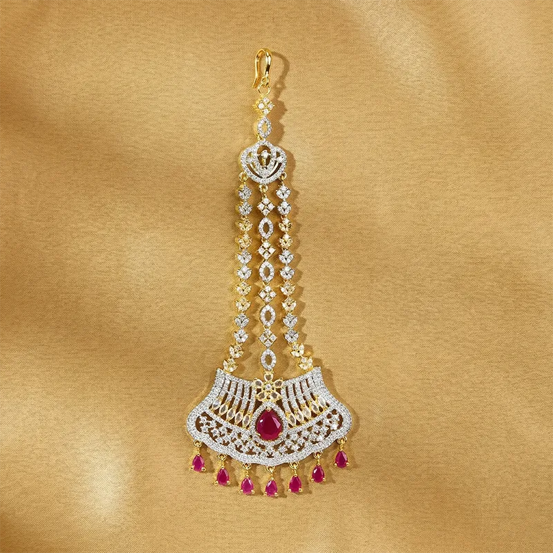 Complete your traditional look with this stunning Ruby Stone Studded Passa, designed to add a touch of royal charm and sophistication. Crafted with a gold-tone base, this beautiful piece is adorned with shimmering white stones and highlighted by rich ruby-toned teardrop accents for a luxurious finish.