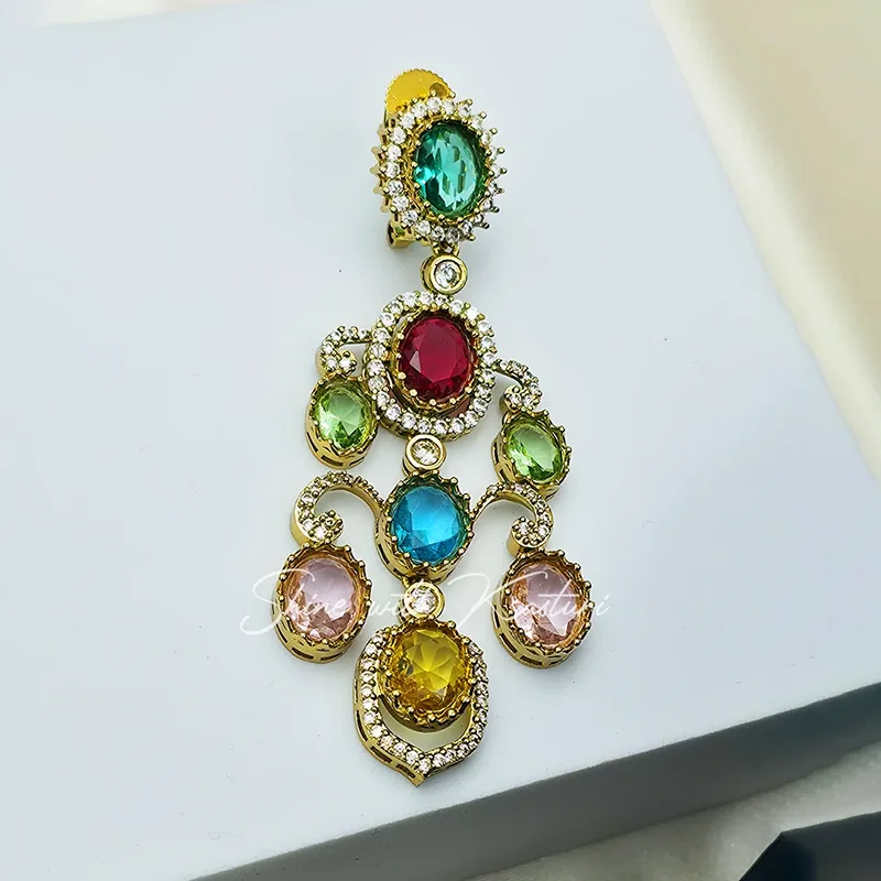 Make a regal statement with these Sabya-inspired earrings. Featuring a vibrant mix of emerald green, ruby red, and citrine yellow stones set in an antique gold-toned finish. These handcrafted Victorian-style drops are the perfect accessory for high-fashion ethnic ensembles and bridal wear.