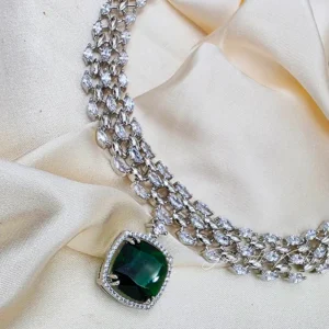 Selene CZ & Stone Necklace Set in Blue. Well designed with shimmering cubic zirconia and dazzling stones, this necklace set combines modern style with classic elegance. The striking blue accents enhance its charm, making it ideal for weddings, festive events, or evening parties. Pair it with western outfits, it will also look good for bridesmaid jewelry and is sure to add a touch of sophistication and glamour.
