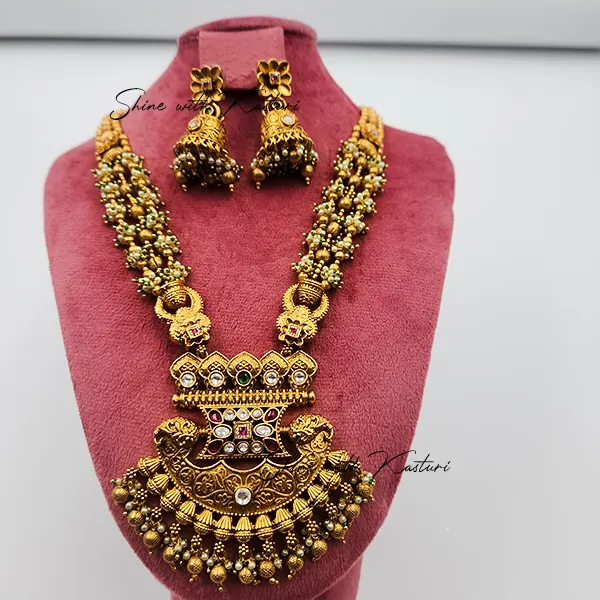 Ideal for weddings, festive occasions, and cultural celebrations, this long necklace set pairs beautifully with sarees and silk lehengas, elevating your ethnic look with unmatched grace. Complete with matching jhumka earrings, this ensemble offers a harmonious blend of tradition and sophistication, ensuring you shine with elegance at every event.