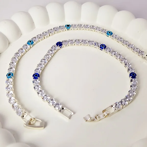 Inspired by the classic evil eye as believed in various cultures for own safety and protection against negative energy, this silver pated Evil Eye Bracelet is one of best sellers in minimalist jwelery collection. Featuring a light blue sleek eye-shaped motif that complements the two tone shade of silver plating on tennis zircons, the bracelet loos awesome.