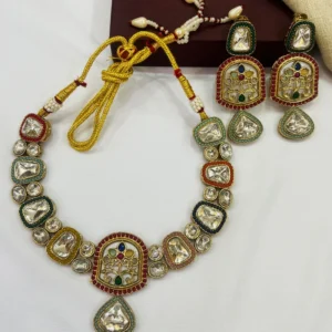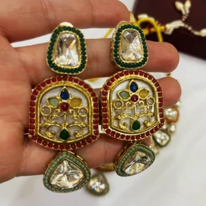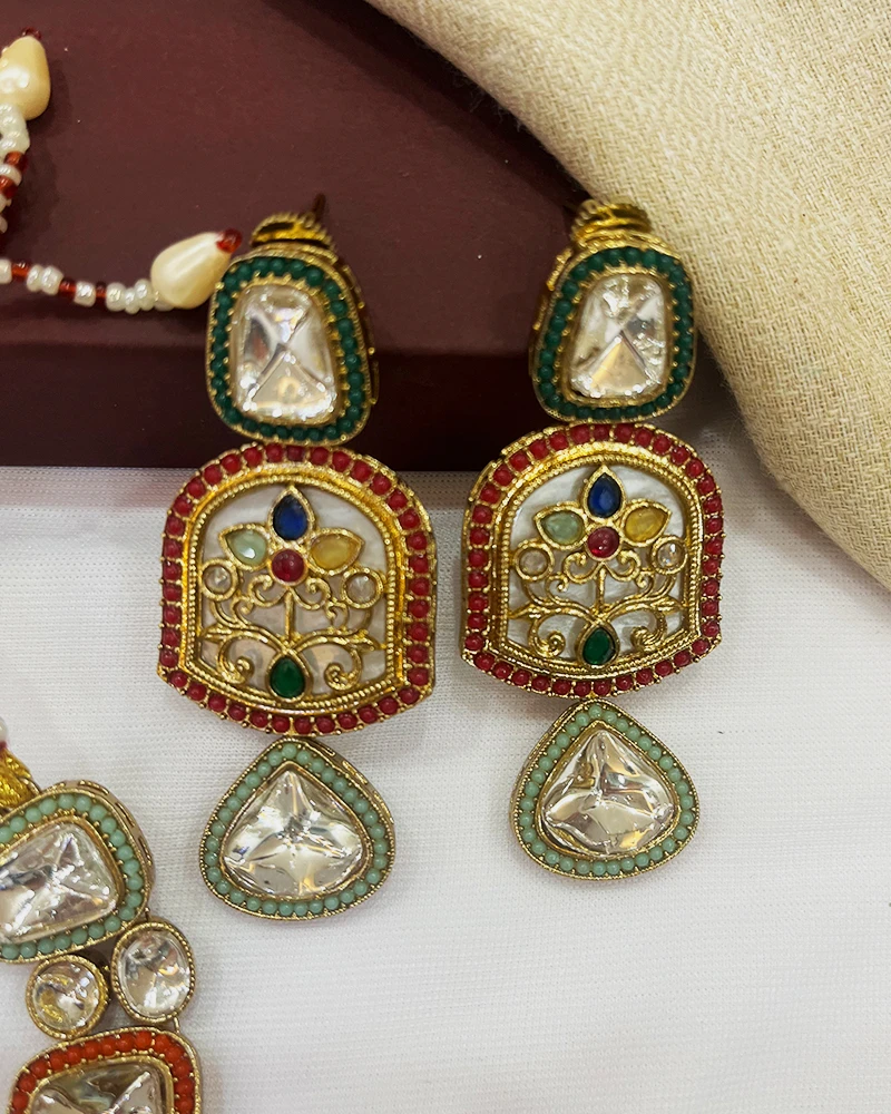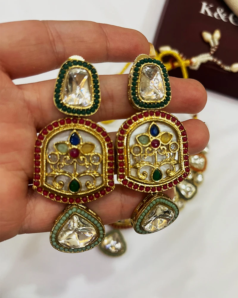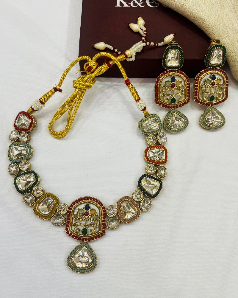 Inspired by Amrapali styles, the Siya Choker Necklace will look very graceful at any occasion. This choker necklace offers a unique combination of colors with stones and delicate handcrafted beads. The vibrant choker necklace will look good with Indo-Western, Western as well as Indian outfits. Shop Indian chokers at Kasturi & Co online or book appointment to view similar trending designs over a call.