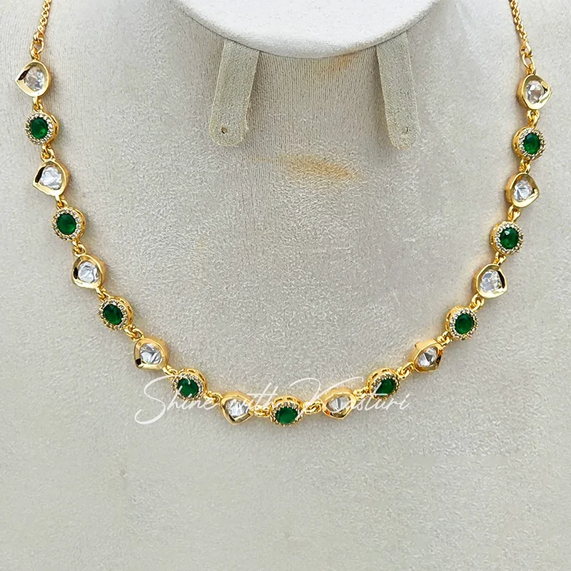 Slim Kundan Choker with Green Stones is designed for those who love understated luxury. This slim-profile choker features a graceful sequence of white kundan stones paired with vibrant emerald green accents, all set in a warm gold-tone finish.