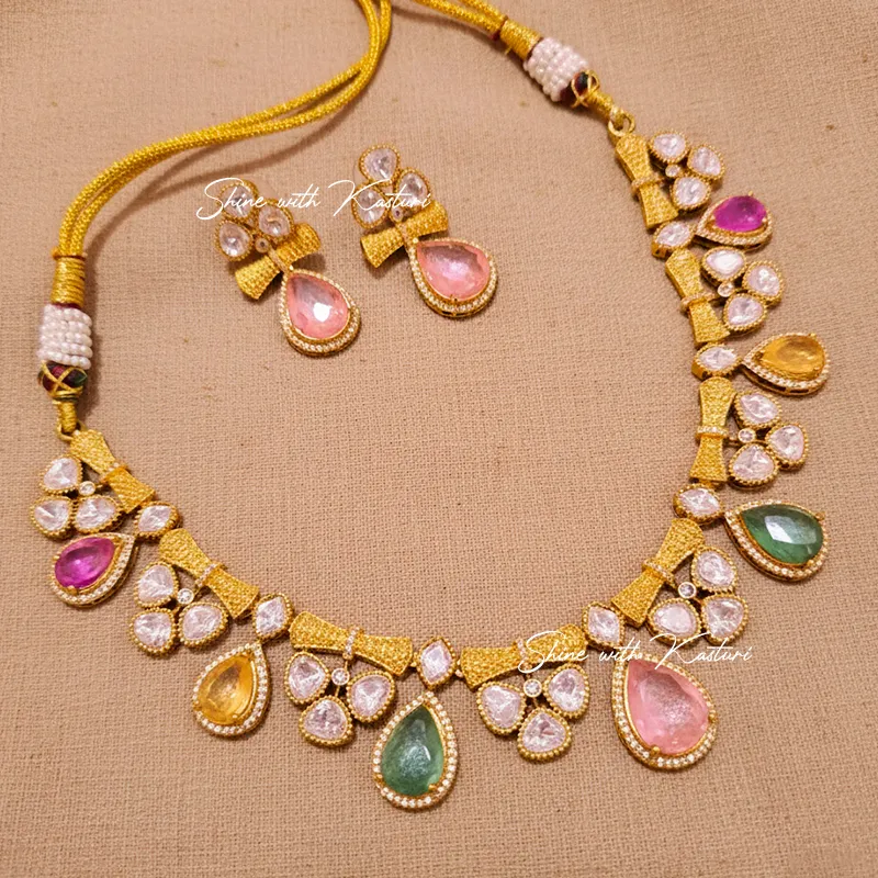 This Kundan & Stone Statement Choker blends an elegant combination of pastel pink and mint coloured stones in a royal assortment. Adorned with majestic brilliance of high quality stones and matching earrings , this chokder is Ideal for brides, festive wear, and statement ethnic styling.