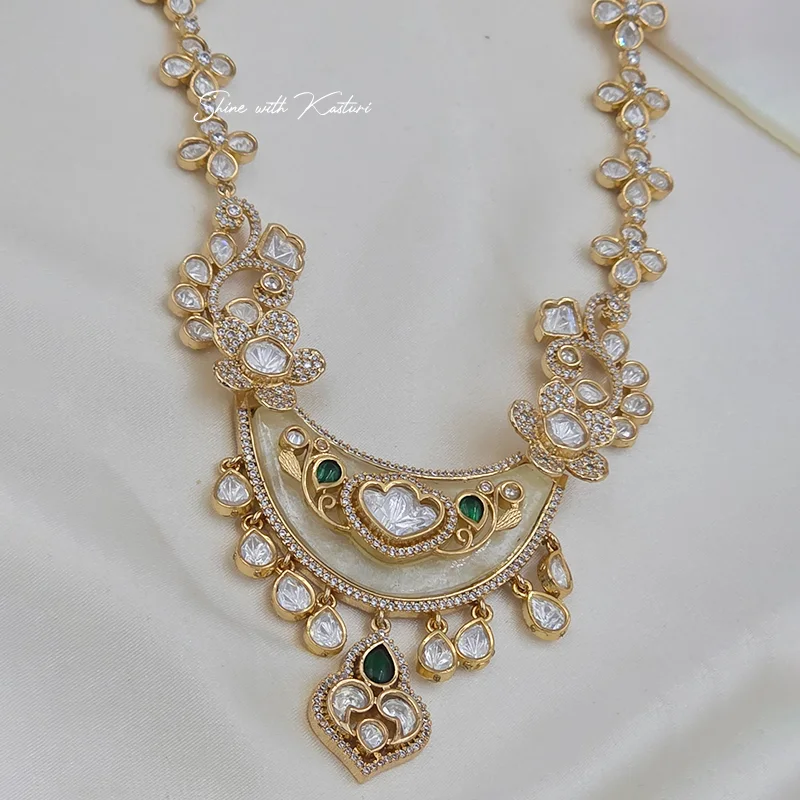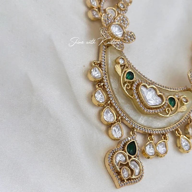 Sofia Polki Necklace with inlay work on Mother of Pearl Pendant with long beautiful earrings in mossainite and inlay. Thi is a premium polki strand with mossainites to give it a distinct character, a masterpiece of handcrafted elegance