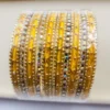 Pink Thread Work Crystal Bridal Bangles Set. Designed with delicate thread work and sparkling crystal embellishments, these bangles combine traditional artistry with modern elegance. The shimmering stones beautifully complement the rich pink base, making them ideal for bridal wear, festive celebrations, or party attire.