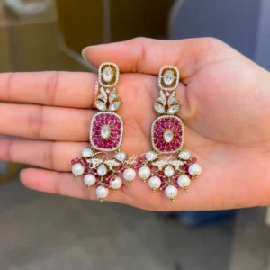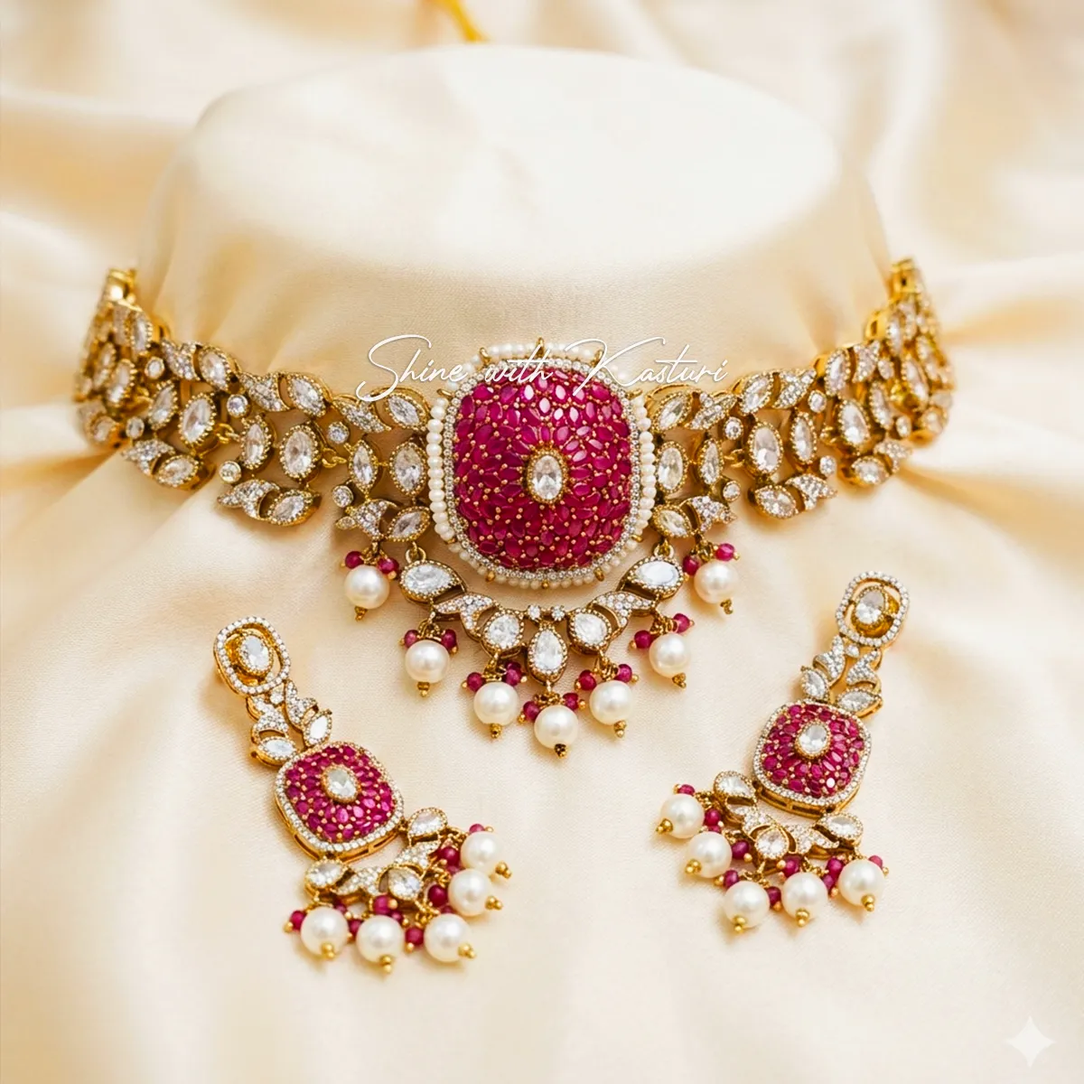 Zarina Premium Micro AD Pink Choker Set. Designed with fine micro American Diamond detailing, this luxurious choker features a rich pink stone centerpiece surrounded by sparkling white stones and delicate pearl drops.