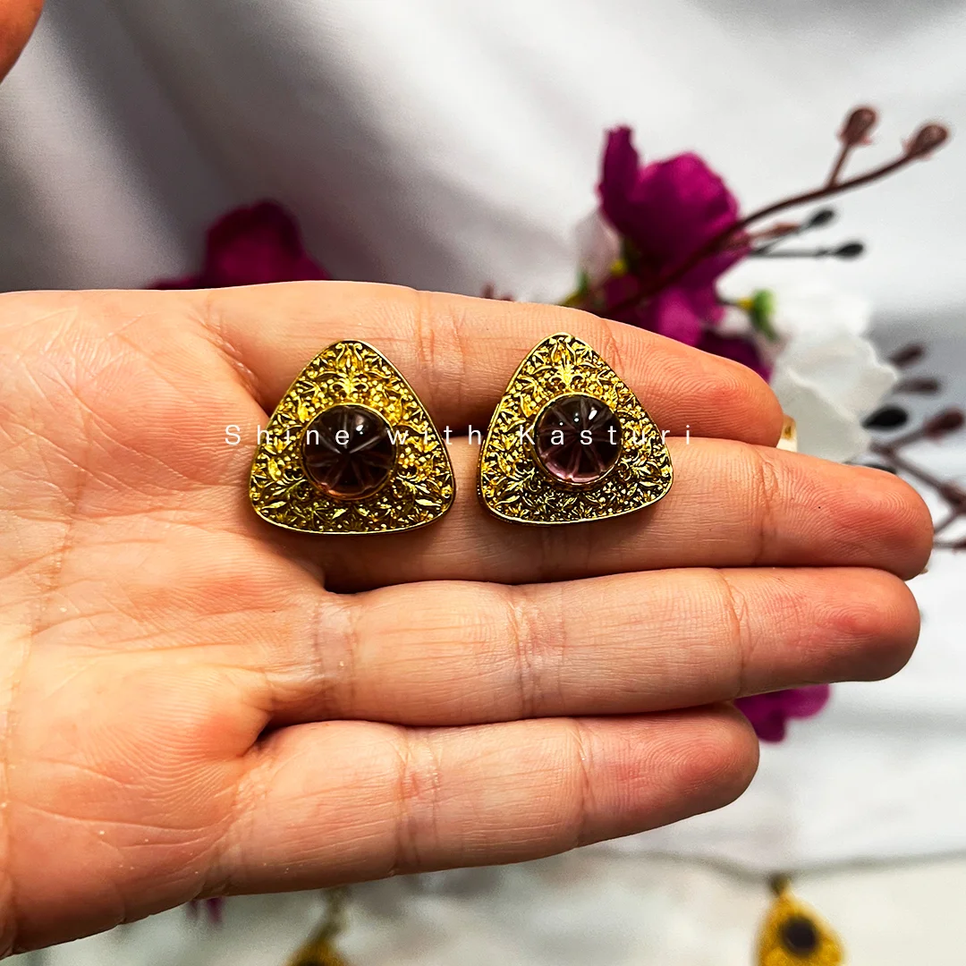 This Amrapali Inspired Necklace is a stunning short necklace in our ‘Shine with Kasturi’ collection. The special design draws inspiration from the artistry of Amrapali style jewelry and is enriched with carved stones. This item will draw attention from everyone when you wear it, and it will add elegance to your costume. It is one of those perfect one of a kind piece of jewelry for those who love to wear unique jewelry.