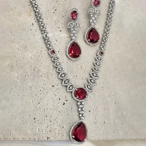 The sparkling white stones perfectly complement the rich red ruby tone, creating a luxurious diamond-look finish that enhances both traditional and contemporary outfits. Whether styled with a saree, lehenga, gown, or festive attire, this necklace adds grace and glamour instantly.